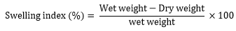 10 mg of microbeads were placed in 0.1 N HCl buffer (pH 1.2) and allowed to swell up to a constant weight. After this the microbeads were removed, blotted with filter paper and their change in weight was measured. The swelling index was then calculated from the following formula: