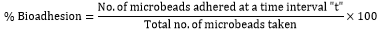 The mucoadhesive properties of various formulations of theophylline loaded alginate-sesbania beads were evaluated by the in vitro wash-off method. Freshly excised pieces of goat gastric mucosa [1 cm×1 cm, collected from a slaughter house (permission for the same was taken from Institutional Animal Ethical Committee)] were mounted on a glass slide using thread. About 50 beads were spread out on each piece of mucosa and then hung from the arm of the tablet disintegration test apparatus. The tissue specimen was given a regular up and down movement in a 1 l vessel containing 900 ml of 0.1 N HCl (pH 1.2), maintained at 37±0.5 °C. The adherence of beads was regularly observed. The beads that remained adhered to the mucosa were counted at regular intervals for up to 10 h and % bioadhesion was calculated as: