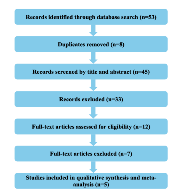 The study selection process followed the PRISMA 2020 framework, encompassing four main phases: identification, screening, eligibility, and inclusion. During the identification phase, records were retrieved through comprehensive searches of electronic databases. In the screening phase, titles and abstracts were reviewed to assess their relevance. Full-text articles were then evaluated for eligibility based on predefined inclusion and exclusion criteria. Studies that metal eligibility requirements were included in the final meta-analysis. Duplicate records were removed, and reasons for exclusion were documented at each stage of the process. Ultimately, five studies were selected for inclusion, each providing binary outcome data suitable for analysis.