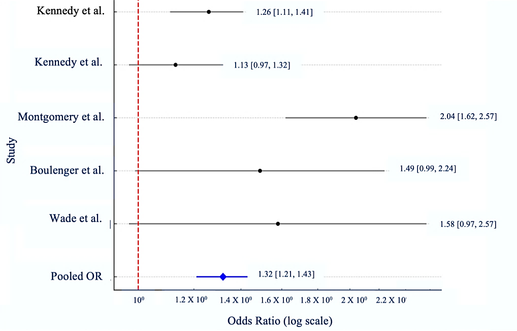 Pooled odds ratio (pooled OR) = 1.32, and 95% confidence interval (CI) was found to be 1.21-1.43.