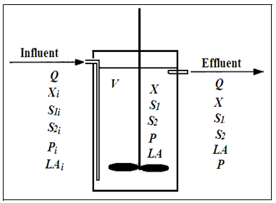A mathematical model has been developed for continuous bioreactor system [10, 11] by making overall mass balance for biomass, substrates (glucose and protein) and products (pediocin and lactic acid). Where, the incoming feed is sterile. The system is perfectly stirred and hence, the concentrations of all components in the outlet stream are equal to those in the reactor. No non ideality is present in the bioreactor. The schematic of continuous bioreactor is shown in fig. 1.