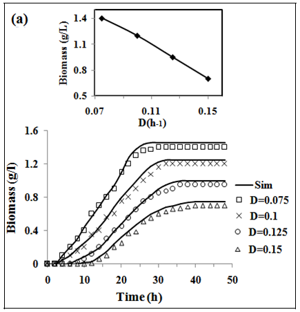 Where, V is the reactor volume (L), Q is the effluent flow rate (L/h), microbial cell concentration is Xi (g/l) in influent and X (g/l) in effluent stream. μ is specific growth rate (h−1).