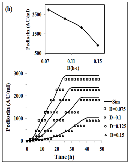 Results: The maximum pediocin activity was observed 2743 AU/ml in continuous cultures at dilution rate of 0.075 h-1. The values of correlation coefficient (R2) were in the range of 0.94 to 0.98. The predicted model was well validated.