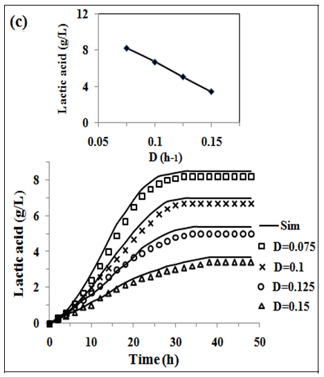 where, LA is lactic acid concentration (g/l), α1is the growth-associated constant (g-lactic acid g-biomass-1) and β1 is the non-growth associated constant (g-lactic acid g-biomass-1h-1) for lactic acid.