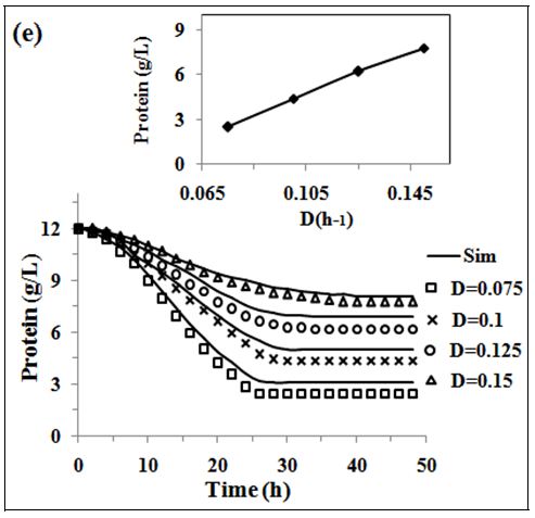 In fig. 2 (a, b and c) the experimental and simulated (equations 2, 5 and 6) values of concentration of biomass, pediocin and lactic acid respectively are plotted against operating time of 5 l continuous stirred type bioreactor on respect of dilution rate (0.075-0.15 h-1). Inlet concentration of glucose and protein were 20 g/l and 12.67 g/l respectively. Similarly, the fig. 2(d and e) show graphically the both experimental and simulated (equations 3 and 4) results of glucose and protein consumption by micro-organisms varying with time. From the analysis of fig. 2 (a, b, c, d and e), it appears that steady state has been attained at 26, 30, 34 and 38 h continuous operation owing to dilution rates of 0.075 h-1, 0.1 h-1, 0.125 h-1 and 0.15 h-1 respectively. As shown in fig. 2(b), the highest pediocin activity was obtained 2743 AU/ml at dilution rate of 0.075 h-1. The values of correlation coefficient (R2) were in between 0.94 to 0.98 respectively. The agreement between simulated and experimental results is satisfactory in all cases validating the mathematical model. It further establishes the applicability of growth kinetics determined using small scale reactor, also in case of large scale bioreactor. In the insets of fig. 2 (a, b, c, d and e), the steady state concentration of biomass, pediocin, lactic acid, glucose and protein have been plotted against dilution rate. The inset fig. clearly reveal that the values of steady state concentration of products, namely, biomass, pediocin and lactic acid increase with decrease of dilution rate and in the contrary, the values of steady state concentration of glucose and protein show increasing trend with the increase of dilution rate. This is because of the fact that with increase of dilution rate, there is a reduction of residence time resulting in decrease in the extent of utilization of substrates for the conversion to biomass, pediocin and lactic acid. The value of kinetic parameters has been estimated in previous article [12].