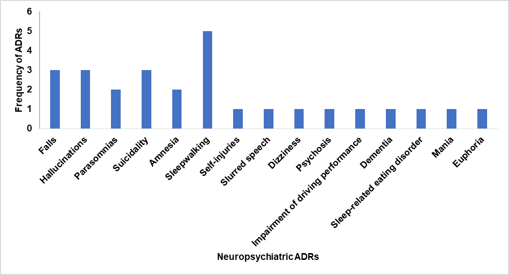 Among the nine studies reviewed, sleepwalking was the most frequently reported neuropsychiatric adverse drug reaction (ADR), cited in five studies. Hallucinations, suicidality, and falls followed closely, each noted in three studies. These ADRs were primarily associated with Z-drugs, especially zolpidem, suggesting a consistent pattern across different populations and study designs.