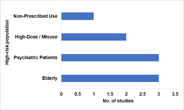 From the studies included, the elderly and psychiatric populations were consistently identified as the most at-risk groups for experiencing neuropsychiatric ADRs (table 5 and fig. 1). The use of sedative-hypnotics in these groups often coincided with comorbid conditions, polypharmacy, and altered brain sensitivity to psychoactive agents.