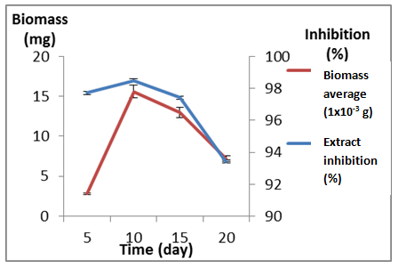 Fig. 1: The α-glucosidase inhibitory activity and biomass production of Streptomyces sp. IPBCC. b.15.1539 grown at ISP2-medium for 5-20 days at room temperature.