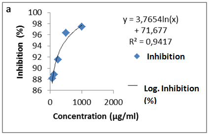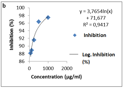 Results of logarithmic equation showed that y = 4.6686 In (x)+64.287 with R2 = 0.9908 (fig. 2a). The value of x = 0.047 ug/ml. The results were then compared with acarbose which showed y = 3.7654In (x)+71.677 with R2 =0.9417 and x = 0.003 ug/ml. The IC50 of acarbose was lower than the IC50 value of α-glucosidase inhibitor produced by Streptomyces sp. IPBCC. b.15.1539 (fig. 2b).
