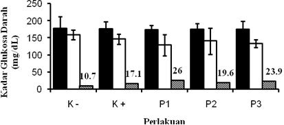 Fig. 3: Normal and hyperglicemic blood glucose level and acarbose for mice treated with ethyl acetate extract of Streptomyces sp. IPBCC. b.15.1539 (1, 10 dan 100 times sequentially). P1 extract, < P2 extract, < P3 extract, sucrose, positive control, and negative control