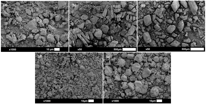 Fig. 6: SEM images of KTZ (a), FUMA (b), OXA (c), KTZ FUMA (d), KTZ OXA (e)