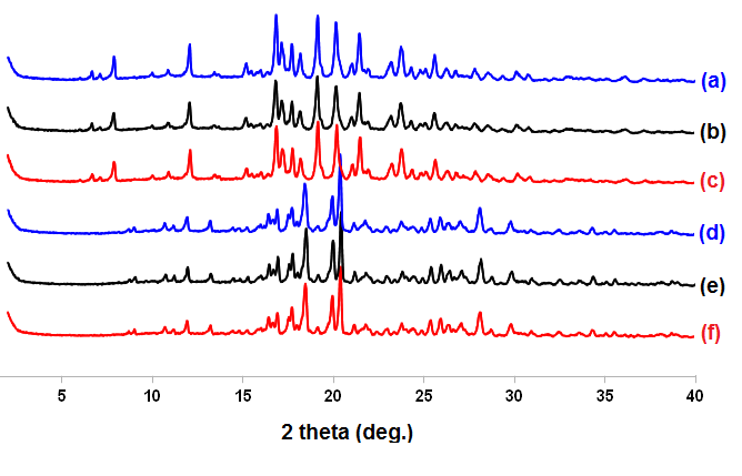 Fig. 8: PXRD pattern in stability study at 40oC/75% RH of KTZ FUMA day 0 (a), KTZ FUMA day 30 in open condition (b), KTZ FUMA day 30 in close condition (c), KTZ OXA day 0 (d), KTZ OXA day 30 in open condition (e), KTZ OXA day 30 in close condition (f)
