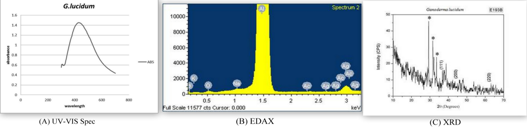 (A)UV-Vis spectrum after 30 min of incubation (B) EDAX analysis of G. lucidum AgNPs (C) XRD analysis of G. lucidum AgNPs