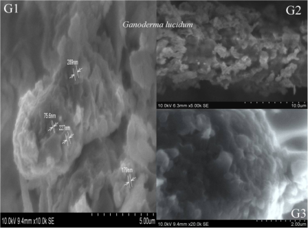 | Fig. 2: SEM images of G. lucidum. (5.00 µm, G2-10.00 µm andG3-2.00 µm) | Fig. 3: FE-SEM images of G. lucidum. (G1-(300 nm) |