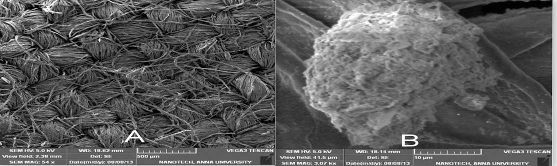 Fig. 5: SEM images of fabric. (A) Silver nanoparticles fabricated fabric, (B) Silver nanoparticles untreated fabric-showing the growth of bacteria