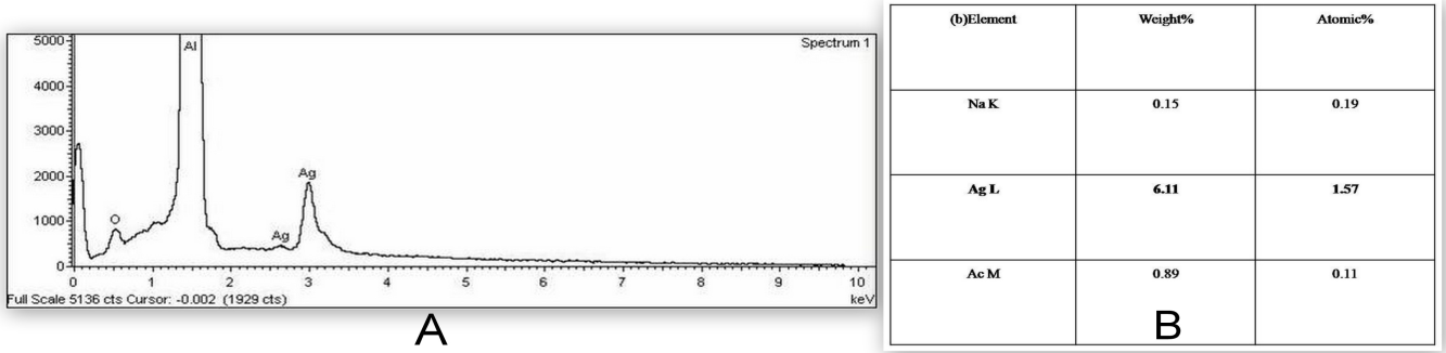Fig. 6: EDAX of silver nanoparticles fabricated fabric, (A) shows the graph (B) shows the percentage of silver nanoparticles