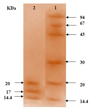 Fig. 1: Silver Stained electrophoretogram of Ammonium Sulphate fractionation of the aqueous extract of Fragaria ananassa fruit (FA-D). Lane 1: Silver stained electrophoretogram (on 10% SDS-PAGE) of FA-D fraction showing different protein bands. Lane 2: shows standard protein markers (94KDa-10KDa)