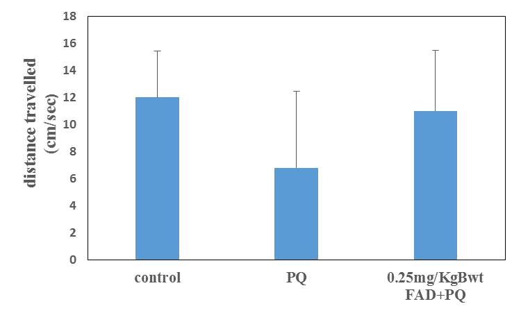 The Zebrafish were grouped into experimental groups each containing minimum 15-20 in number. The dosage of FA-D was expressed in terms of their protein content. The experimental groups used for the tests comprise. A) Experimental Parkinsonism induced group (55 mM PQ was administered intraperitoneally (i. p.), alternatively for a period of 7days). B) FA-D control group (0.25 mg/kg body weight suspended in physiological saline (PS) was administered once in alternative days for 5 days). C) FA-D treated group ((FA-D+PQ) 0.25 mg/kg body weight of FA-D fraction was administered once in alternative days for 5 days subsequent to the administration of PQ alternatively for a period of 7days) D) Control group (PS-injected but otherwise identically treated fishes served as control group). The injections were conducted using syringes with a mean injection volume of 5 µl/g body weight.