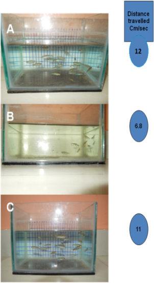 The locomotor activity of zebra fish was measured as per the protocol followed by [17] with slight modifications. Small experimental tank (30 cm X 10 cm X 15 cm) containing 3 l waters was used to assess the locomotor activity of zebrafish. A transparent plastic film was placed in front of the tank indorder to divide the tank into four segments. Fish were placed individually in the tank and their behavior was video recorded for 5 min after a 10 min habituation period. Spontaneous swimming activity was measured by recording the distance.