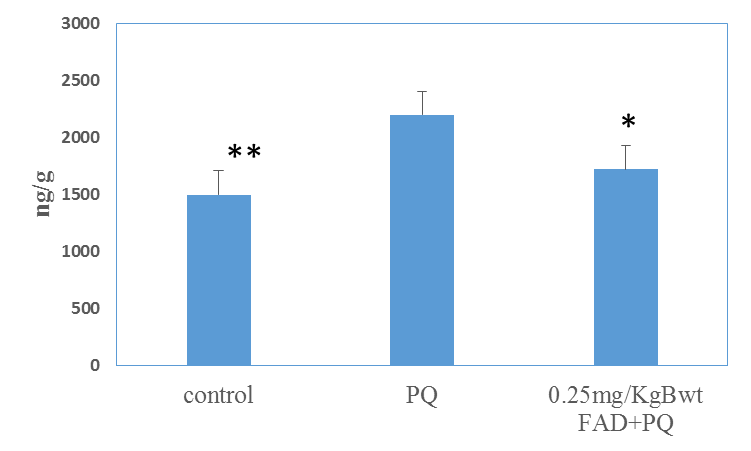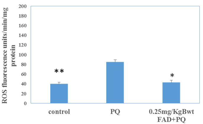 Fig. 5: Effects of FA-D on mitochondrial ROS levels in the PQ zebra fish brain. Data are shown as mean+SEM. n=6-8, *p<0.05, **p<0.01 vs PQ group