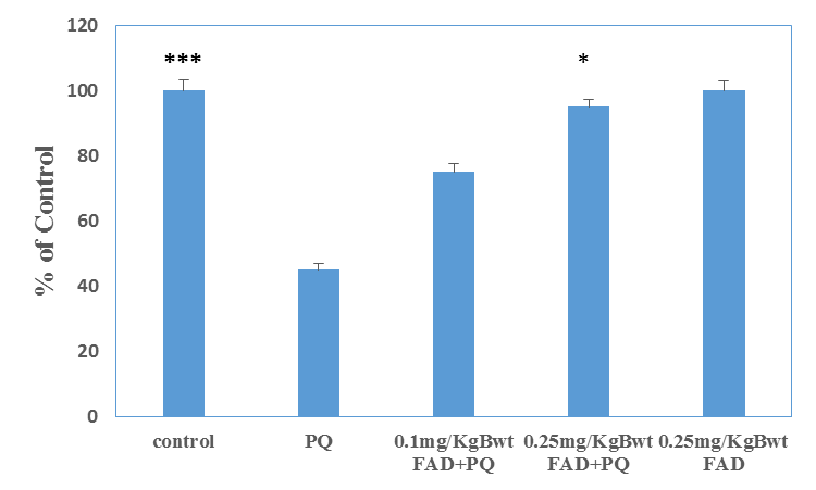 Fig. 4: Effects of FA-D on the activity of complex-I in the PQ zebra fish brain. Data are shown as mean+SEM. n=6-8, *p<0.05, **p<0.01, ***p<0.001 vs PQ group