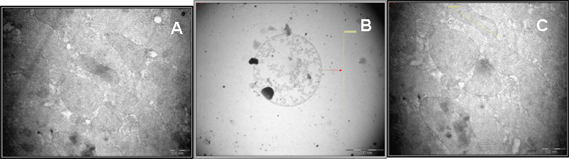 Fig. 7: Effect on morphology of mitochondria by TEM analysis A) Control B) PQ treated group C) PQ+FA-D treated group