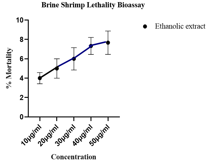 Fig. 3: Effect of ethanolic extract of leaves of Colocasia esculenta on percent mortality using brine shrimp lethality bioassay