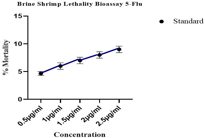 After enumerating the number of shrimps surviving after 24 h the percentage inhibition was evaluated. The Lethality concentration (LC50) of the standard, 5-FU is represented in the table 6.