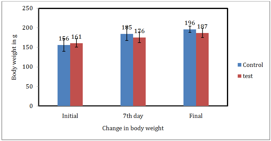 The fig. shows the effect of mahagoni leaf powder on the change in body weight pattern when compared to the normal control group. The test group was administered with 2000 mg kg-1 and the normal control group was administered with the physiological saline. The values are the mean body weight of six rats in each group with standard deviation (n=6).