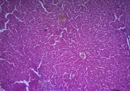 Fig. 2: Liver sections (10 X) of (a) Normal group, (b) Treated group. Photographs shown are taken at 10X resolution. Normal architecture of liver having central vein and surrounded hepatic cells can be observed in both the groups. There were no observable changes in MAE treated group when compared to normal control group
