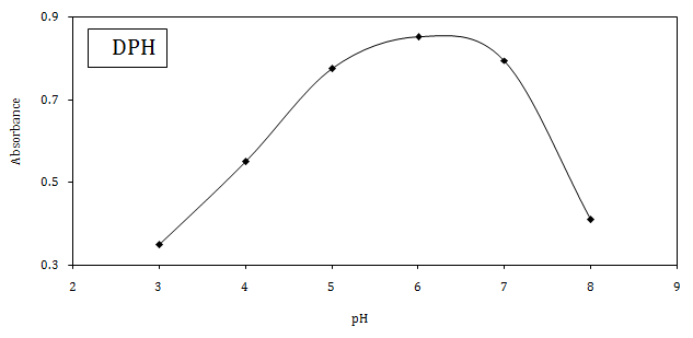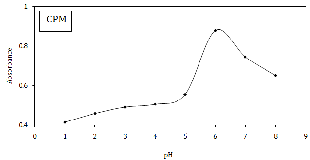 The influence of pH on the ion-pair complex formations of DSL, CPM, DPH and FXO with RB dye has been studied using different types of buffers of different media. The optimum buffer associated with the maximum color intensity is disodium hydrogen phosphate-citric acid of pH=6 in case of DPH, CPA or FXO but pH=6.8 in case of DSL (fig. 3). Buffer volume was determined by applying the same experiment and variation the volume regularly (0.5-4.0 ml). The higher absorbance value obtained at using 2.0 ml.