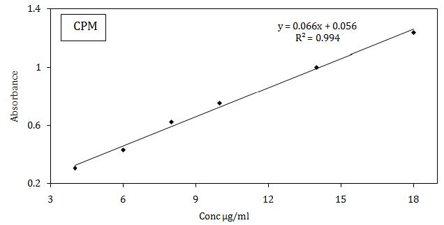 Into a series of separating funnels, accurately measured aliquots DSL, CPM, DPH or FXO in the concentration range shown in (table 1) were pitted out and then 2.0 ml of 1×10-3M of RB dye was added. The solution was diluted to 10 ml with distilled water after the addition of 2.0 ml of acetate buffer of pH 6 for CPM, DPH or FXO but buffer of pH 6.8 for DSL was added. The ion-pairs were extracted with 10 ml of dichloromethane by shaking for 2.0 min and then, the combined dichloromethane extracts were dried over anhydrous sodium sulphate. The absorbance of colored ion-pair complexes were measured within 5.0 min of extraction against the reagent blank prepared in the same manner except addition of drugs.