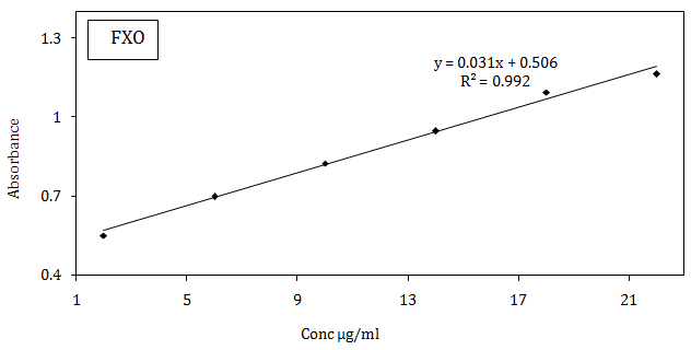 Fig. 4: Calibration curves for determination of: DSL (1–6 µg/ml), CPM (4–18 µg/ml), DPH (6–16 µg/ml) and FXO (2–22 µg/ml) under optimum conditions