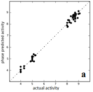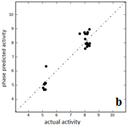 With known experimental activities, a 3D-QSAR model was created for each hypothesis, using ligands that are aligned to the associated pharmacophore on five points. Since the dataset consists of significant diversity, a pharmacophore-based 3D-QSAR model was developed which considered the sites on a molecule that is matched to the hypothesis. Statistical validity and robustness of the QSAR models can be evaluated using various parameters including SD, F, Pearson-R, r2 values of the training set and q2 values of the test sets. We started the evaluation of QSAR equations with a look at SD, r2 and F values. These values are associated with training set results. Table 2 shows six pharmacophore hypotheses which indicated satisfactory results of the training sets. Pearson-R and q2values, which are associated with the test set, were taken into consideration in the next step. A stringent criterion of the difference between r2 and q2 values of less than or equal to 0.2 was applied to filter the hypotheses further. This resulted in an elimination of hypothesis ADHRR.256. The final filter of RMSE value less than 0.5 gave the best pharmacophore model, ADHRR.187. Fig. 2a and 2b shows a plot of predicted activity versus actual activity for training and test set, respectively, based on the best hypothesis ADHRR.187.