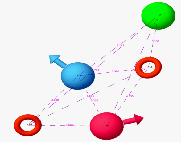 Fig. 3: Intersite distance (Å) in the geometry of the pharmacophore hypothesis (ADHRR.187). Red spheres with vectors represent acceptor feature, blue spheres with vectors represent donor feature, green spheres represent hydrophobic feature and orange rings represent aromatic feature