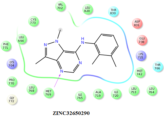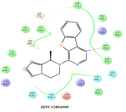 | ZINC12804309 | -7.03 | Met769, Leu768, Gly772, Leu694, Pro770, Ala719 |
