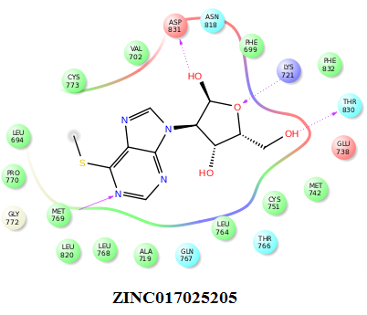 | ZINC017025205 | -9.22 | Met769, Asp831, Lys721, Thr830, Leu768, Gly772, Leu694, Leu820, Pro770, Ala719 |
