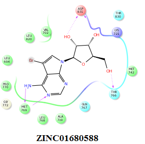 | ZINC01680588 | -9.94 | Met769, Asp831, Thr766, Leu768, Gly772, Leu694, Leu820, Pro770, Ala719 |