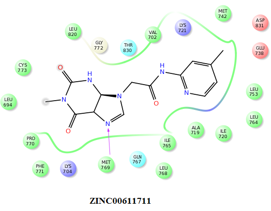 | ZINC04822304 | -9.48 | Met769, Glu738, Thr766, Leu768, Gly772, Leu694, Leu820, Pro770, Ala719 |