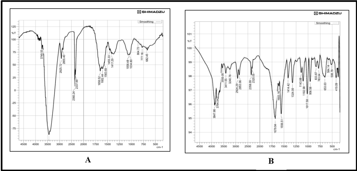 Fig. 1: FT-IR spectra of P-SDF (A) and O-SDF (B)