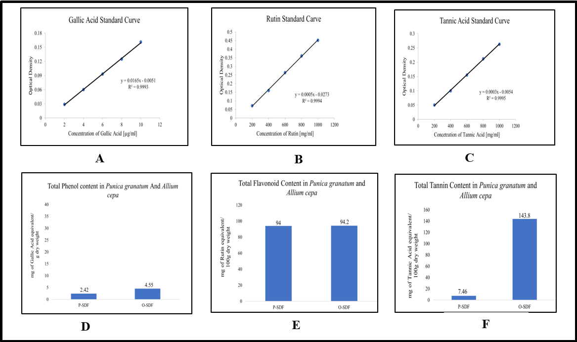 Fig. 2 below represents the total phenol, flavonoid, and tannin content of pomegranate (P-SDF) and onion (O-SDF) along with standard curves of gallic acid, rutin and tannic acid, respectively.