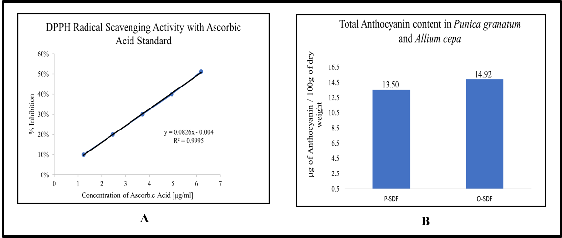 Results: The peel of pomegranates allowed the isolation of 3-4 g of SDF, but onion peels yielded only 1-2 g of SDF. The SDF derived from onion peel exhibited greater phenol content of 140.32 mg GAE/100g and flavonoid and tannin levels of 62.41 mg RE/100g and 54.67 mg TAE/100g, respectively, compared to pomegranate peel SDF, while also demonstrating superior water holding capacity at 2.95 g/g. Onion peel SDF demonstrated an IC50 value of 778.81 µg/ml, while pomegranate exhibited an IC50 value of 390.62 µg/ml for DPPH radical scavenging activity. The colour analysis revealed that both samples exhibited bright yellow colours along with identical chroma values.