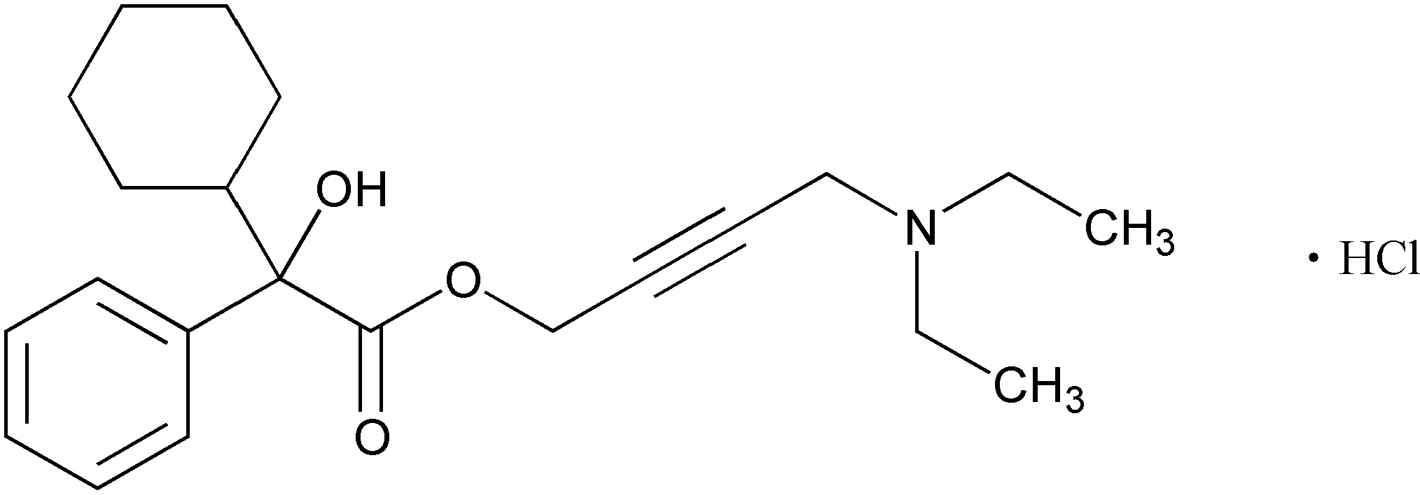 Oxybutynin hydrochloride is chemically designated as 4-(diethylamino) -2-butynyl (RS)-2-cyclohexyl-2-hydroxy-2-phenyl acetate hydrochloride (fig. 1) [1]. It is an antimuscarinic drug with a great selection for the muscarinic receptors of the bladder. It is used in the management of urinary frequency, urgency, and incontinence in detrusor instability and in the treatment of nocturnal enuresis [2].