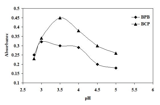 It was observed that the effective extraction of the complex depends on the type of the buffer used and its pH. The effect of pH was studied by extracting the colored complexes in the presence of various buffers such as KCl–HCl (pH 1.0-2.2), NaOAc–HCl (pH 1.99-4.92) and NaOAc–AcOH (pH 3.6-5.6). It is evident that the maximum color intensity and maximum absorbance were found in NaOAc_HCl buffer. It is evident that the absorbance of the ion pair complex was maximal at pH 3.5 and 3.0 for BCP and BPB methods, respectively (fig. 2). Buffer volume was determined by applying the same experiment and variation the volume regularly (0.5-4.0 ml). The higher absorbance value and reproducible results were obtained by using 2.0 ml of buffer solutions.