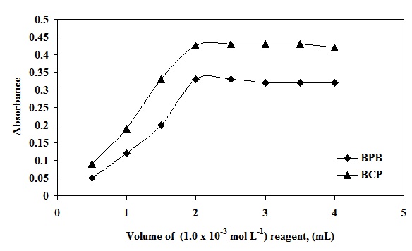 Fig. 3: Effect of volume of (1.0 ×10−3 mol l-1) BCP and BPB reagent on the ion pair complex formation with (8.0 μg ml-1) OXB