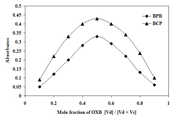 The stoichiometric ratios of the ion-pairs formed between OXB and the reagents were determined by applying the continuous variation [18] and the molar ratio [19] methods at the optimum wavelengths. In continuous variation method, equimolar solutions were employed: a 1.0 x 10-3 mol l-1 standard solution of drug and 1.0 x 10-3 mol l-1 solution of dye was used. A series of solutions was prepared in which the total volume of the studied drugs and the dye was kept at 2.0 ml. The drug and reagent were mixed in various complementary proportions (0.2:1.8, 0.4:1.6, 0.6:1.4, 0.8:1.2, 1.0:1.0, 1.2:0.8, 1.4:0.6, 1.6:0.4, 1.8:0.2) and completed to volume in a 10 ml calibrated flask with the appropriate solvent for extraction following the above mentioned procedure. In the molar ratio method, the concentration of OXB was kept constant 1.0 ml of (1.0 x10-3 mol l-1) while that of dyes (1.0 x10-3 mol l-1) is regularly varied (0.2–2.4 ml). The absorbance of the prepared solutions measured at optimum condition and at the optimum wavelength for each complex.