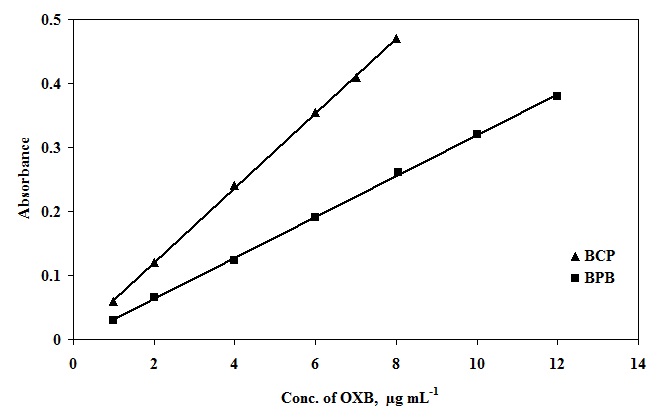 Fig. 4: Calibration curves for determination of OXB (1.0–8.0 μg ml-1) using BCP and (1.0–12 μg ml-1) using BPB