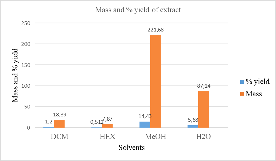 Fig. 1: Extraction yields (%, w/w; Mass, mg) from the roots of Asparagus suaveolens using solvents of different polarities (HEX: n-hexane, DCM: dichloromethane, MeOH: methanol and H2O: water)