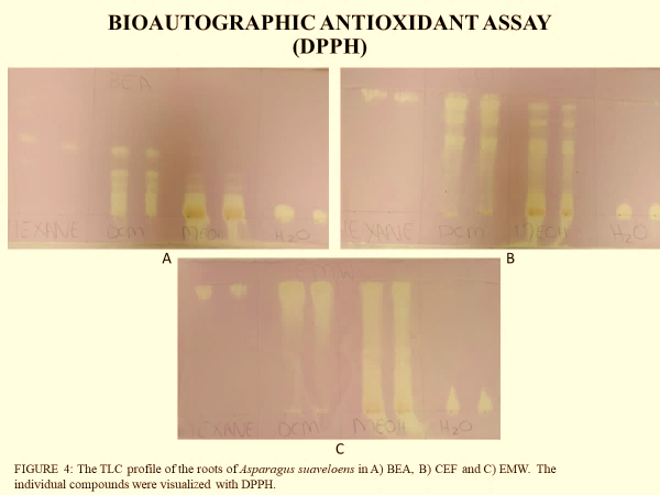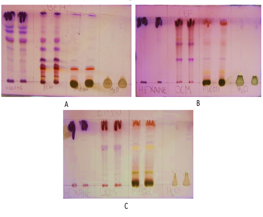 These assays were performed to assess the extracts’ antioxidant potential through multiple mechanisms, enabling correlation between phytochemical content and bioactivity. The TLC chromatographic technique was used to conduct the bioautography assay based on the method primarily reported by Masoko, as well as Siddeeg and their colleagues [24], with some modifications. Solvent systems with different polarities were prepared by mixing different solvents at different ratios, which included ethyl acetate, methanol, and H2O (EMW) (40/5.5/5, v/v/v); benzene, ethanol, and ammonia (BEA) (45/5/0.5, v/v/v); and finally, chloroform, ethyl acetate and formic acid (CEF) (25/2/5, v/v/v). Each of the prepared solvent systems was poured into the thin-layer chromatography tanks. Approximately 100µl of the extract (125 mg/ml) was spotted on TLC plates (Macherey-Nagel, Pre-coated TLC sheets ALUGRAM, silica gel 60 UV245, 20 cm x 20 cm, Germany) and placed in the tanks and closed to maintain optimal conditions. The plates were then allowed to develop until the solvent front had reached at least 80% of the plate before being taken out and allowed to dry. About 0.2%solution of 2,2-diphenyl-1-picrylhydrazyl (DPPH) was prepared by dissolving 0.2g of DPPH in 100 ml of methanol. Vanillin-sulphuric solution was prepared by dissolving 0.1g of vanillin in 28 ml of methanol and 1 ml of sulphuric acid. Thereafter, the dried TLC plates were sprayed with a 0.2% solution of DPPH free radical and vanillin-sulphuric solution.