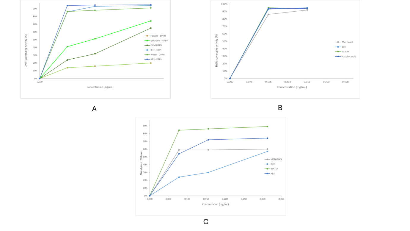 Quantitative evaluation for antioxidant activity through the DPPH, FRAP and H2O2 assay shown in fig. 4 (A, for DPPH inhibition; B, for H2O2 inhibition and C for reducing power ability of the extracts).